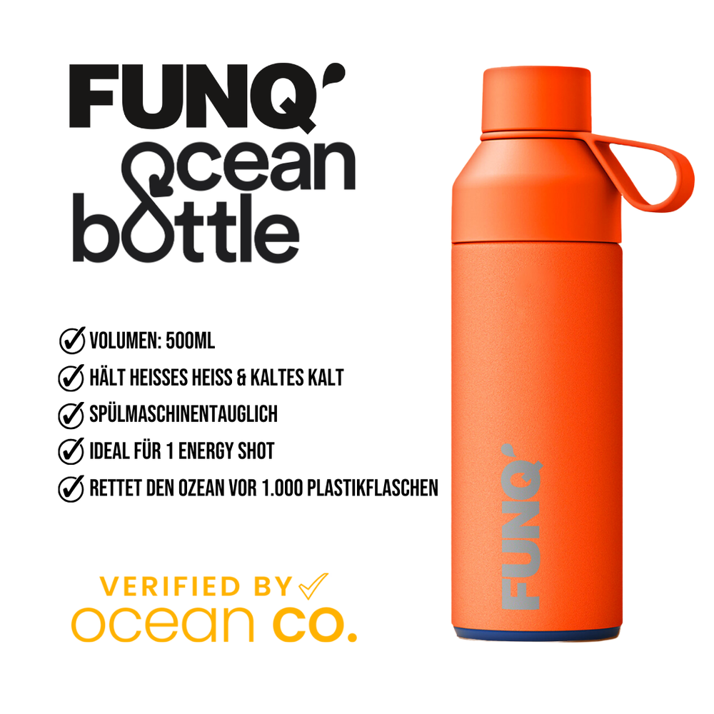Die Ocean Bottle ist der ideale Begleiter für deinen aktiven Lifestyle. Ob für sweaty Sportsessions oder deine Hydration für unterwegs. Läuft nicht aus, hält Kaltes lange kalt und ist einfach ideal für einen FUNQ’ Energy Shot.