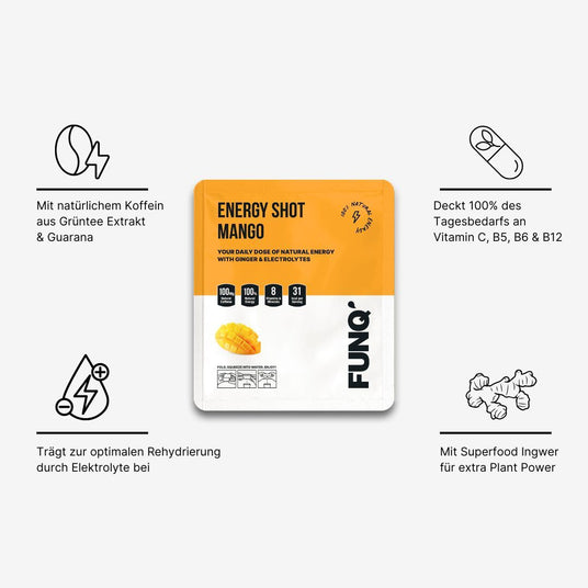 Entdecke den FUNQ’ Energy Shot Mango! Der Energy Shot der nächsten Generation deckt 100% deines Tagesbedarfs an Vitamin C, B5, B6 & B12 und enthält weitere wichtige Vitamine und Mineralien. Deine Nährstoffversorgung wird mit Superfoods unterstützt und steigert deine tägliche Performance. Für langanhaltende Energie den ganzen Tag.