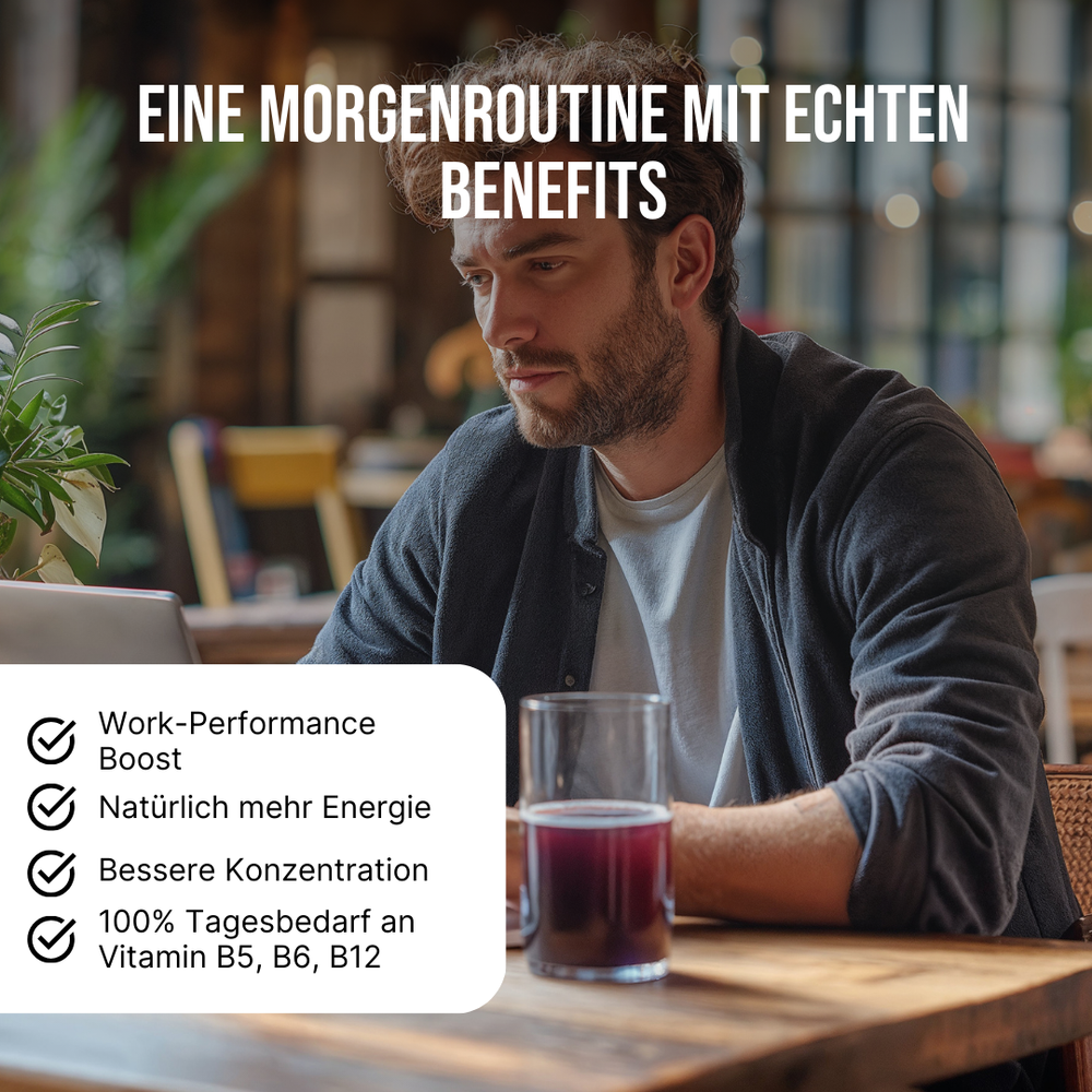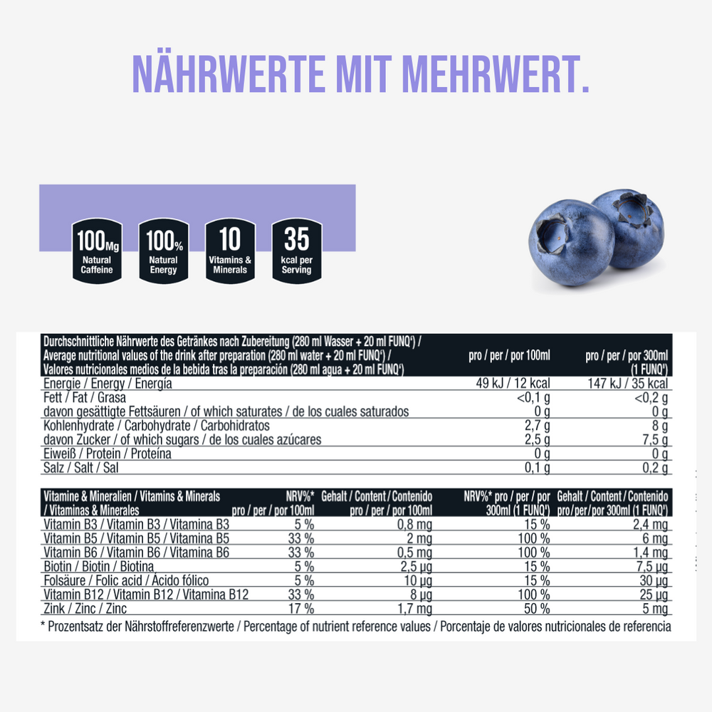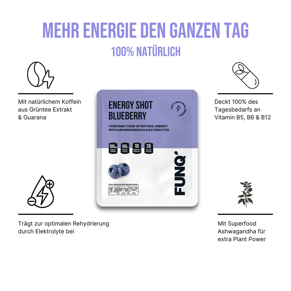 Der Energy Shot Blueberry mit natürlichem Koffein, Guarana, Elektrolyten und 100% deines Tagesbedarfs an Vitamin B5, B6 & B12 vereint höchste Funktionalität aus natürlichen Inhaltsstoffen. Unterstützt gezielt einen aktiven Lifestyle.